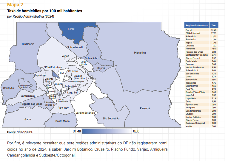 As regiões menos violentas do DF são Lago Norte (2,19), Guará (1,50) e Águas Claras (0,68) e as que registraram zero mortes, como Arniqueira, Candangolândia, Cruzeiro e outras.