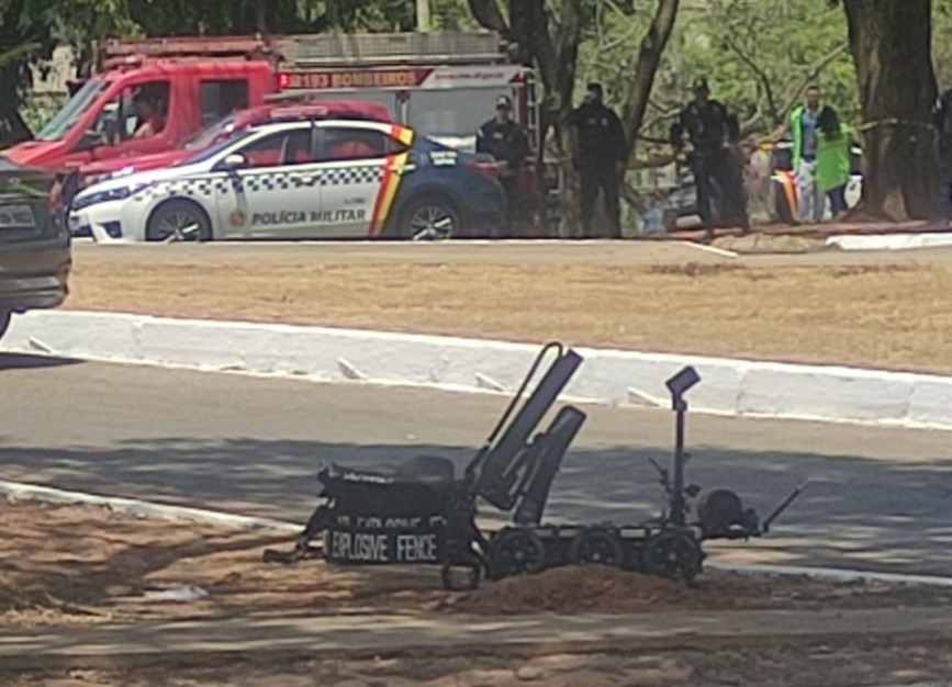 O robô antibombas da PM faz uma varredura no objeto deixado no terminal para avaliar se de fato é um material explosivo. O trânsito segue interditado na região.