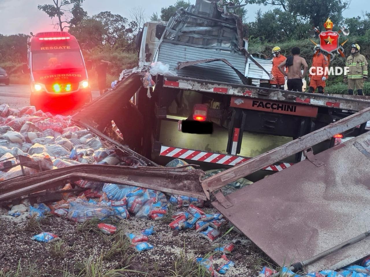 Um caminhão com sacos de arroz capotou na BR 020, em Planaltina, no final da tarde deste domingo (23), sentido para Formosa.