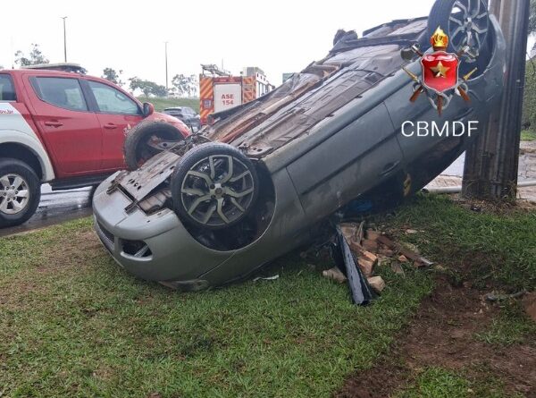 Um Fiat Pálio, de cor cinza, bateu em um ônibus de Planaltina de Goiás e capotou na BR 020, nas proximidades do Condomínio Bianca, sentido Plano Piloto, nesta quinta-feira (04).